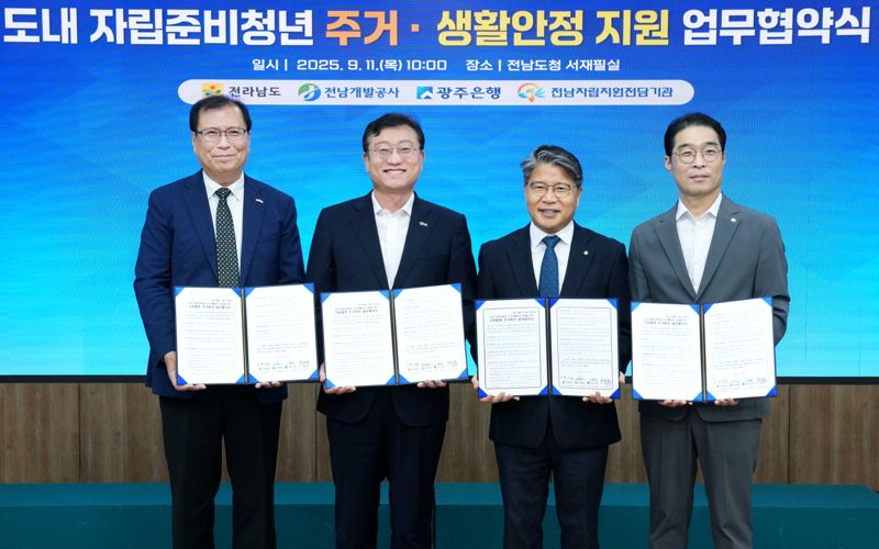 전남도는 지역 자립준비청년의 주거와 생활 안정을 지원하고자 11일 도청 서재필실에서 전남개발공사, 광주은행, 전남자립지원전담기관과 함께 전국 최초의 통합 주거복지 모델 구축을 위한 업무협약을 체결했다고 밝혔다.