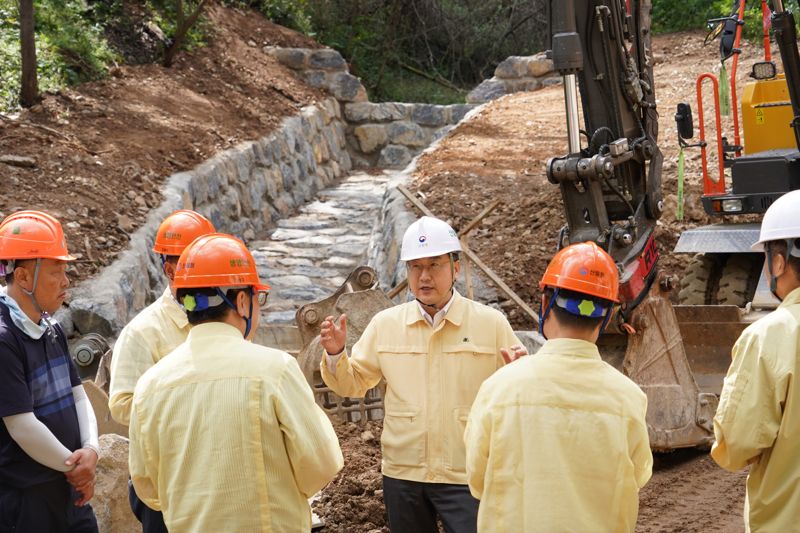 [파이낸셜뉴스] 김인호 산림청장(정면 가운데)이 11일 올 봄 대형산불 피해를 입은 경북 청송의 산사태예방사업 현장을 찾아 공사 추진 상황 및 안전 상태를 점검을 하고 있다.