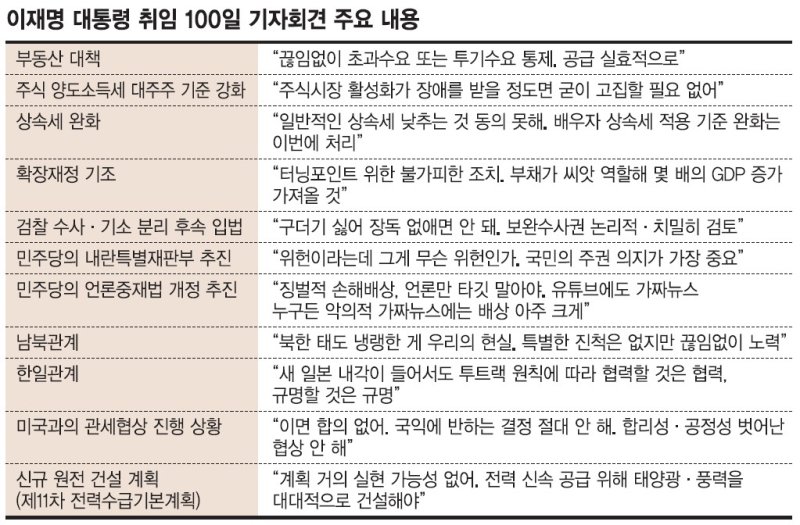 이 대통령과 트럼프 대통령의 한미 정상회담 이후 합의문이 나오지 않았다는 일각의 지적에 대해서도 적극적으로 반박했다. 이 대통령은 "(이번 협상은) 우리가 무엇을 얻으러 간 것이 아니라 미국의 일방적 관세 증액에 대해 최대한 방어하러 간 것"이라며 "방어만 하면 됐지, 우리가 이익 되지 않은 (협상에) 사인을 왜 하나. 최소한 합리적인 사인을 하도록 노력해야 한다"고 했다.