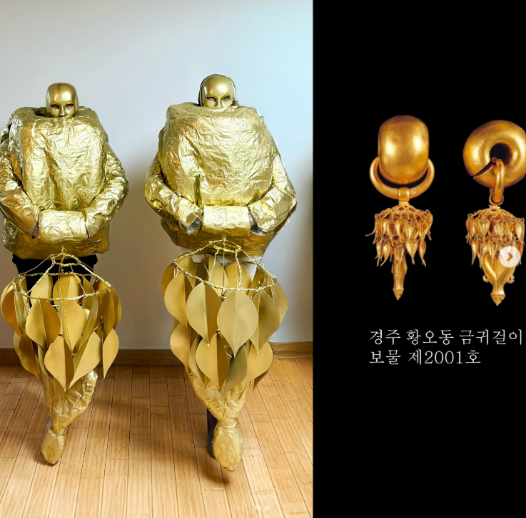 주축이 되는 중심고리인 상체는 금박으로 포장하고 얼굴은 금빛 마스크로 가렸다. 앞으로 모은 두 팔과 손은 연결금구와 노는고리가 됐다. 바람에 흔들리는 귀걸이 장식인 샛장식과 드림도 정교하게 구현했다. 한 쌍의 귀걸이니 분장도 두 명이 했다. A씨는 오른쪽, 사촌은 왼쪽 귀걸이다.