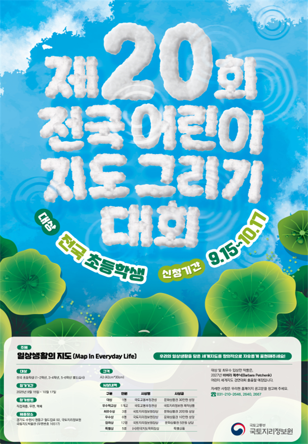 공모 기간은 이날부터 오는 10월 17일까지다. 작품은 국토지리정보원으로 방문하거나 우편 또는 택배로 제출할 수 있다.