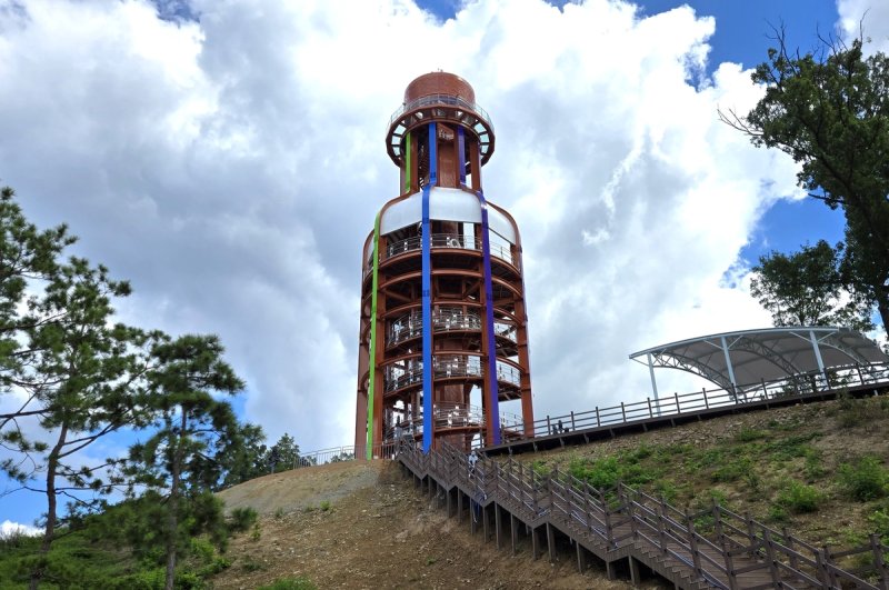 (영동=연합뉴스) 박병기 기자 = 충북 영동군은 영동읍 매천리 일라이트호텔 앞에 지상 50m 높이의 '와인전망대'를 건설, 12일부터 일반에 임시개방한다고 밝혔다.