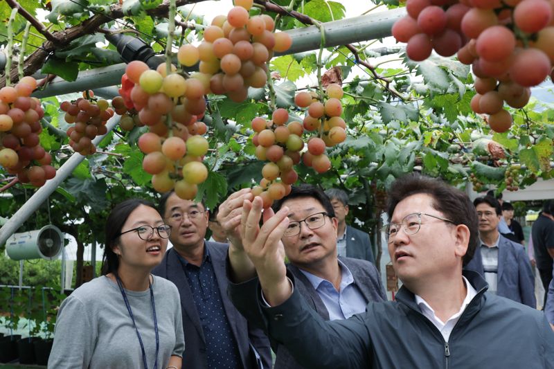 [파이낸셜뉴스] 농촌진흥청은 이승돈 청장이 지난 12일 경기 화성시 송산면에서 포도 스마트팜 선도 농가 팜스토리를 방문해 국내 육성 신품종 포도 재배 현황을 살폈다고 14일 밝혔다.