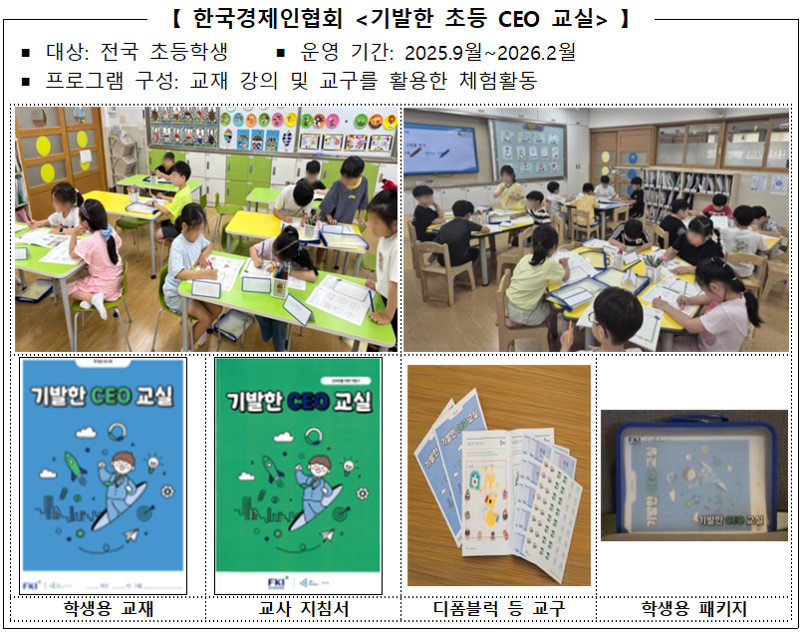 기발한 초등 CEO 교실 프로그램은 초등학교 저학년부터 경제의 기본 원리와 창의적 문제 해결 능력, 기업가정신을 체득할 수 있도록 기획됐다. 어린이들이 경제와 경영의 기초를 쉽고 흥미롭게 배울 수 있는 맞춤형 교육이다.