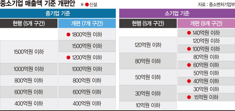 식품제조업 외에도 종이제조업은 기존 1500억원에서 1800억원, 건설업 등은 1000억원에서 1200억원, 운수 및 창고업은 800억원에서 1000억원, 사업시설관리업은 600억원에서 800억원으로 상향됐다. 회사의 중소기업 해당 여부 등은 중소기업현황정보 시스템에서 자세히 확인할 수 있다.