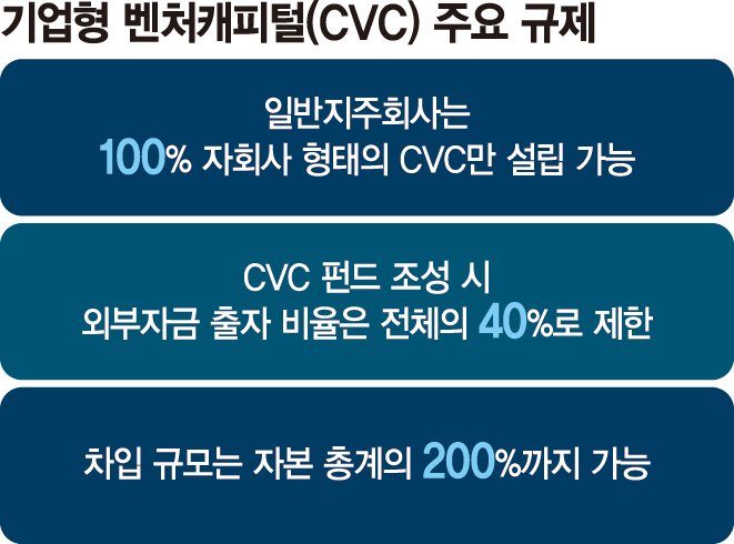 하지만 현재 공정거래법상 지주회사 소속 CVC는 100% 자회사 형태로만 둘 수 있고, 투자금을 조성할 때도 외부자금은 40%까지만 허용된다. 차입 규모 역시 자기자본의 200%로 제한된다.