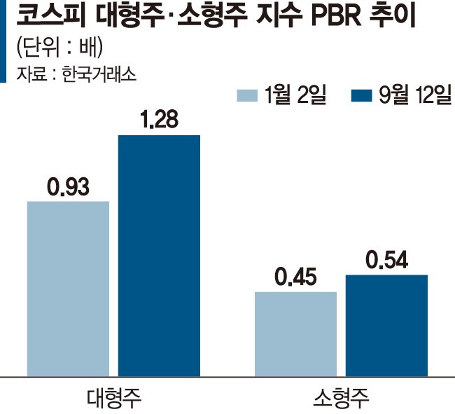 종목별 흐름을 보면 대형주 중심의 상승세가 두드러졌다. 이달 들어 코스피 대형주 지수의 상승률은 6.96%로 코스피지수 상승률(6.58%)을 앞질렀다. 반면 코스피 소형주는 같은 기간 3.15%에 머물렀다. 또 코스피 대형주 PBR은 12일 기준 1.28배로 올해 초(0.93배) 대비 37.6% 올랐다. 반면 코스피 소형주 PBR은 연초 0.45배에서 12일 0.54배로 소폭 올랐다.