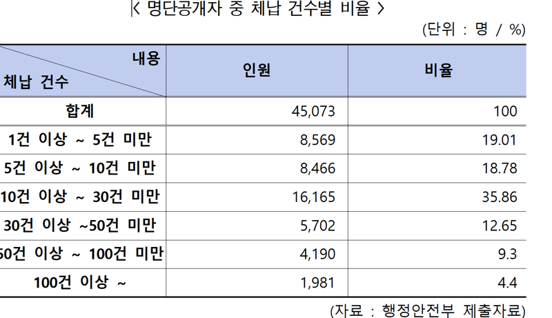10건 이상 체납자를 세분하면 10건 이상 30건 미만이 1만 6165명으로 35.9%, 3명 중 1명 꼴이었다. △30건 이상 50건 미만 5702건(12.7%) △50건 이상 100건 미만 4190명(9.3%), 100건 이상도 1981명(4.4%)에 달했다.