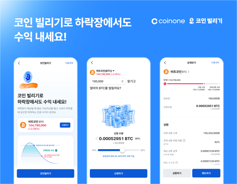 코인 빌리기는 투자자가 보유한 원화를 담보로 가상자산을 대여할 수 있는 서비스이다. 최소 담보금 5만원부터 담보금의 82%까지 가상자산을 빌릴 수 있다. 투자자 1인당 최대 3000만원 한도 내에서 대여가 가능하다.