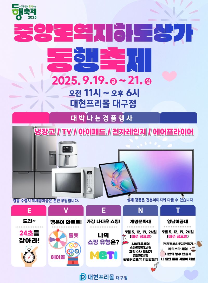 【파이낸셜뉴스 대구=김장욱 기자】"대구도시철도 중앙로역 지하도상가(대현프리몰 대구점)에서 쇼핑도 하고 다양한 이벤트도 즐기세요!"