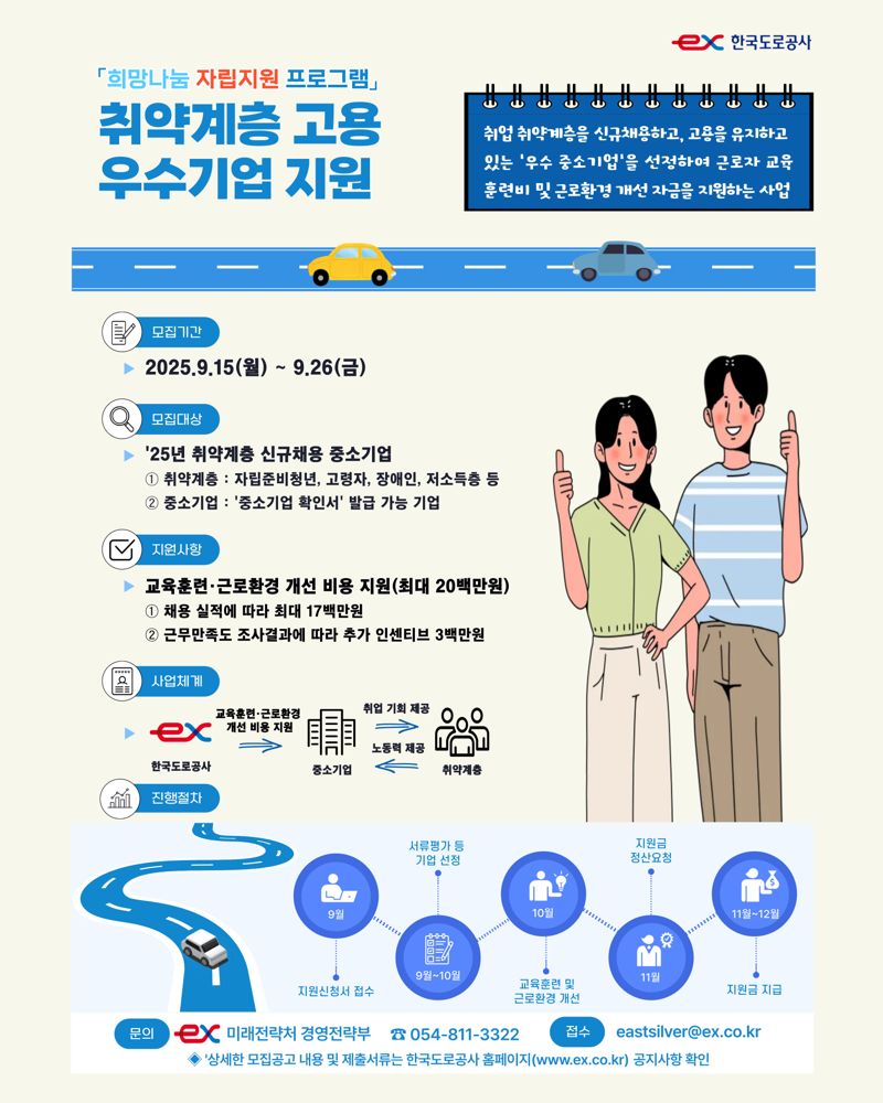 지원방법은 한국도로공사 누리집 공지사항에 게재된 신청서와 필수 서류 등을 작성해 전자우편으로 제출하면 된다. 최종 선정은 10월 중 채용실적 등 평가를 통해 결정된다.