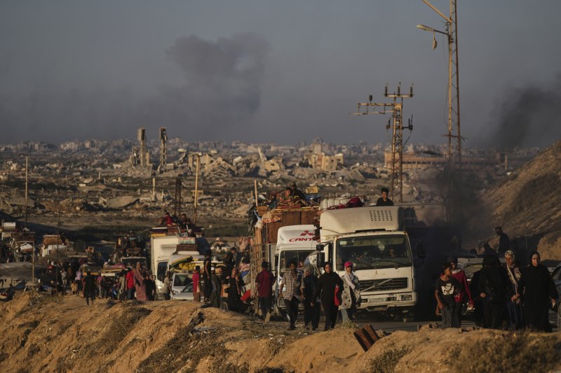 13일(현지시간) 이스라엘군이 가자시티에 대피령을 내린 뒤 가자지구 북부를 떠난 팔레스타인 피란민들이 짐을 싸 들고 남부로 향하는 해안 도로를 따라 이동하고 있다.AP뉴시스