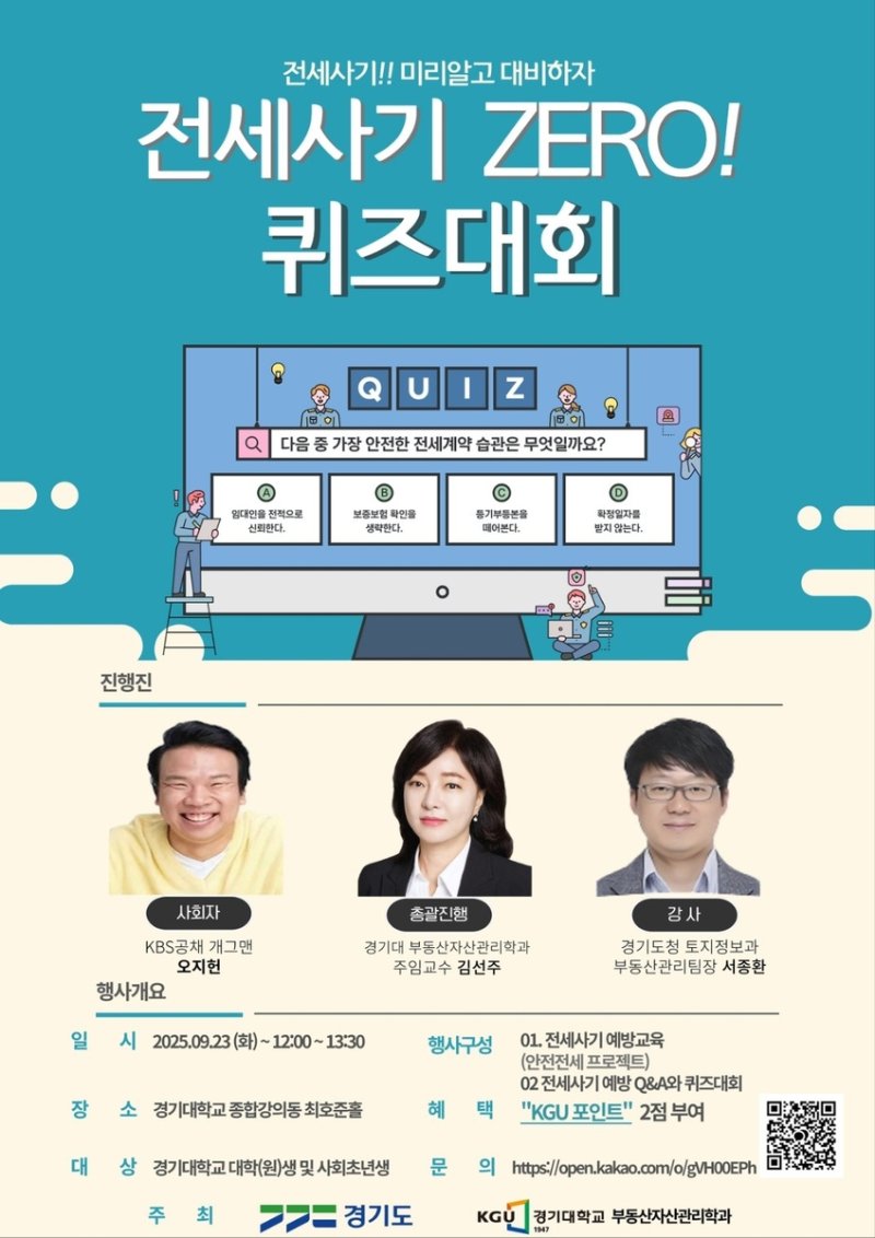김 교수는 "전세 사기 ZERO! 퀴즈대회는 청년의 권리를 지키는 대학의 사명이자 실천"이라며 "경기대가 청년과 함께 보호하고 동행하는 공간임을 보여줄 것"이라고 말했다.