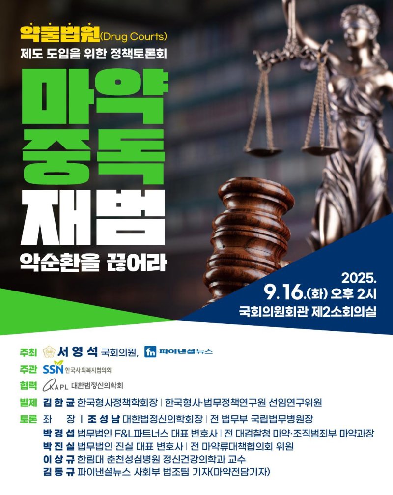 [파이낸셜뉴스] ‘약물법원(Drug Courts)’ 제도 도입을 위한 정책토론회가 16일 오후 2시 서울 영등포구 국회의원회관 제2소회의실에서 열린다. 마약중독 재범의 악순환을 끊을 수 있는 계기가 될 것으로 기대된다.