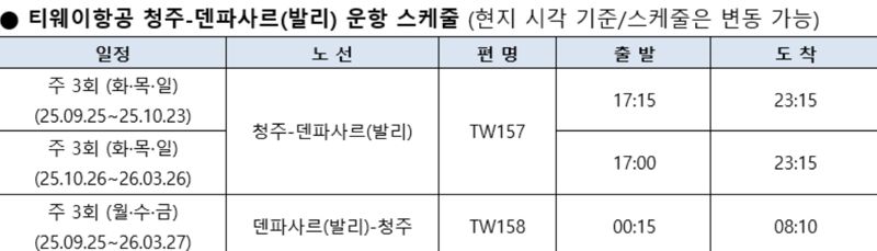 티웨이항공 청주-발리 노선은 9월 25일부터 주 3회(화·목·일) 운항한다. 출발편은 청주국제공항에서 오후 5시 15분경 출발해 발리 덴파사르 공항에 오후 11시 15분 도착한다. 귀국편은 발리 덴파사르 공항에서 오전 12시 15분에 출발해 오전 8시 10분 청주국제공항에 도착한다. 비행 시간은 편도 약 7시간 20분 소요된다. 시차는 한국보다 1시간 느리다.