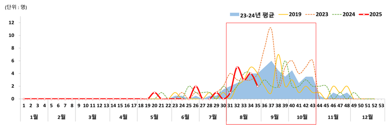올해 누적 환자는 19명(사망 8명)으로 지난해 동기간 누적(21명) 대비 9.5% 감소했지만 여전히 치명률은 42.1%로 높다. 사망한 환자들 모두 △간 질환 △악성종양 △당뇨병 등 기저질환을 가진 비브리오패혈증 고위험군이었다. 고위험군은 피부에 상처가 있는 경우 바닷물 접촉을 피하고 어패류는 반드시 익혀서 섭취해야 한다.