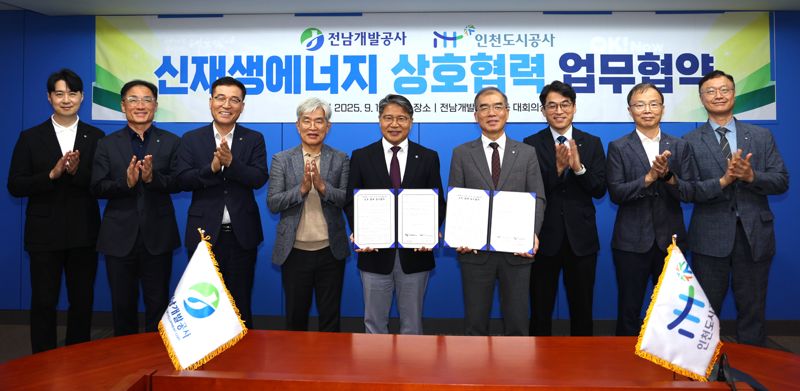 전남개발공사는 16일 전남 무안에 위치한 본사에서 인천도시공사와 정부의 친환경 에너지전환 정책에 부응하고 지역 상생 발전을 도모하기 위한 '재생에너지 정책 기여 및 지역 상생 상호 협력 업무협약'을 체결했다고 밝혔다.