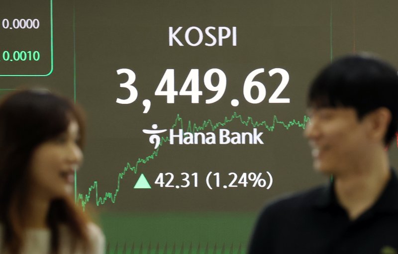 16일 한국거래소에 따르면 이날 오후 1시 41분 코스피는 전일 대비 42.31p(1.24%) 오른 3449.62에 거래를 마쳤다. 이날 지수는 전장보다 13.82p(0.41%) 오른 3421.13으로 출발해 상승폭을 키웠고 장중 한 때 3452.50까지 오르며 3450선을 돌파하기도 했다.