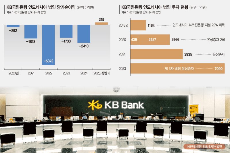 이같은 자구책으로 KB뱅크 인도네시아는 2025년 상반기 순이익 3730억루피아(약 315억 5580만원)를 기록해 전년 적자에서 흑자로 전환했다. KB국민은행의 자회사로 편입된 이후 5년 만에 첫 흑자다. 지난 6월 말 기준 총 대출은 전년 동기 대비 6.14% 늘어난 43조800억루피아(약 3조6445억6800만원)에 달했다. 특히 정상여신이 10.18% 증가하며 전체 대출 성장을 견인했다. 앞서 부코핀은행은 2020년 292억원, 2021년 1818억원, 2022년 5372억원, 2023년 1733억원, 2024년 2410억원의 적자를 기록하면서 KB금융의 대표적인 '아픈 손가락'으로 꼽혀온 바 있다.