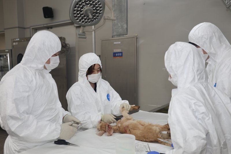 【파이낸셜뉴스 김천(경북)=최용준 기자】 지난 11일 경북 김천시 농림축산검역본부 부검실에 흰 방역복을 입은 수의사 및 연구사 4명이 들어섰다. 염소 한 마리가 철제 부검대 위에서 축 늘어졌다. 해부용 나이프, 큰 가위, 작은 가위, 핀셋이 나란히 놓였다. 수의사는 부검을 진행했고 연구사들은 각각 보조, 장기 사진촬영, 장기조직 채취 등의 역할을 맡았다. 염소 부검에는 1시간여가 걸렸다.