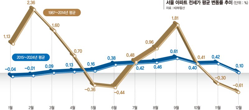 박원갑 KB국민은행 부동산 수석전문위원은 "28년간 통계를 보면 봄·가을 등 이사철 성수기와 비 성수기 간의 격차가 뚜렷하게 나타난 것이 특징이다"고 말했다. 반면 최근 10년(2015년~2024년) 전세가 평균 변동률을 보면 이같은 이사철 특수 패턴이 크게 약화됐다.