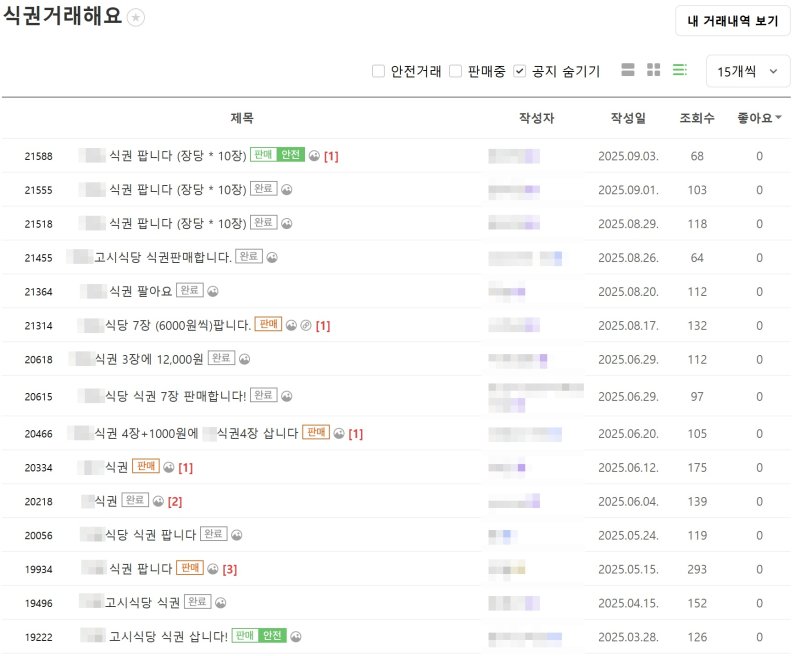 지난 3월에는 모 회사 식권 500장을 275만원에 판매하는 글이 올라왔다. 남아서 싸게 올린다며 놀이공원 식당 식권 70장을 49만원에 판매하거나, 파견 근무로 기존에 갖고 있던 식권을 처분한다며 50장을 30만원에 판매하는 이도 있었다. 한식 뷔페 식권을 장당 1200~1500원 저렴하게 판매하는 글도 많았다.