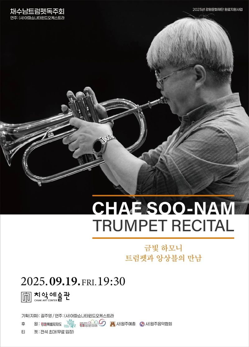 【파이낸셜뉴스 원주=김기섭 기자】강원문화재단은 원로 트럼펫 연주자 채수남의 독주회 '금빛 하모니-트럼펫과 앙상블의 만남'을 2025 원로예술인지원사업 선정 공연으로 지원한다고 17일 밝혔다.