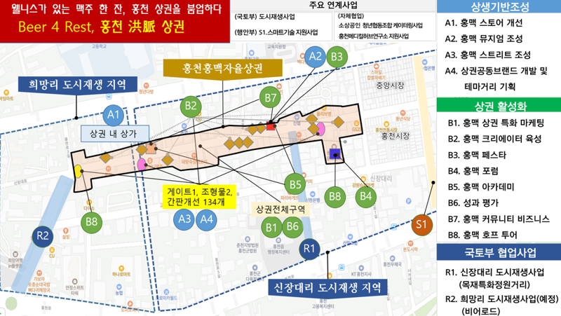 세부 사업으로는 맥주를 테마로 한 ‘홍맥’ 상권 공동브랜드 구축, 특화 마케팅 개발, 테마거리 및 체험공간 조성 등 다양한 프로그램이 기획돼 있으며 이를 통해 빈 점포를 창업 거점으로 삼고 원도심 방문객뿐만 아니라 외부 관광객 유입을 늘려 침체된 상권을 회복하고 지역경제 활성화를 이끌어낸다는 전략이다.