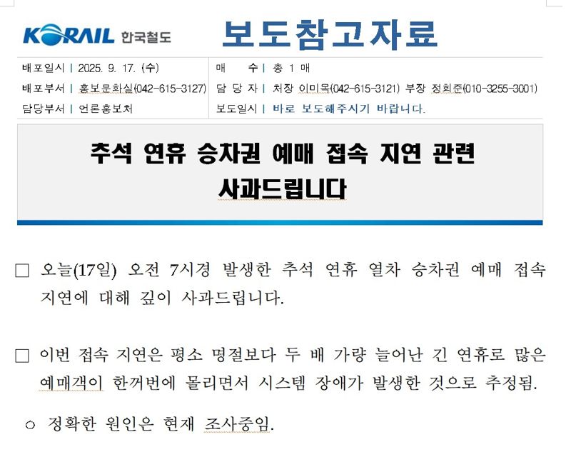 코레일은 사과문에서 "17일 오전 7시경 발생한 추석 연휴 열차 승차권 예매 접속 지연에 대해 깊이 사과드린다"면서 "이번 접속 지연은 평소 명절보다 두 배 가량 늘어난 긴 연휴로 많은 예매객이 한꺼번에 몰리면서 시스템 장애가 발생한 것으로 추정된다"고 밝혔다.