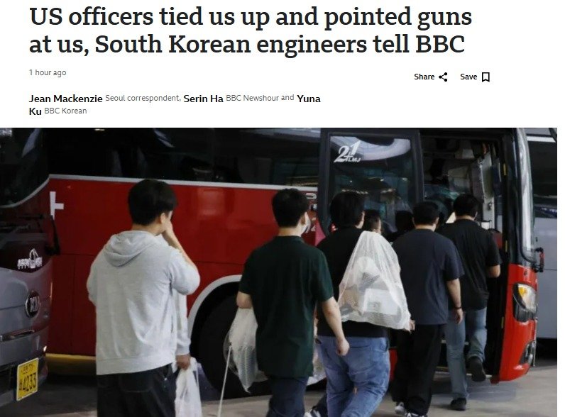 17일(현지시간) 영국 BBC의 보도에 따르면, 익명을 요구한 한국인 노동자들은 "체포 현장에서 미국 단속원들이 총을 겨눠 너무 무서웠다"고 고백했다.