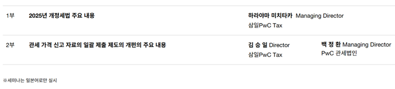 이번 세미나를 기획한 노영석 삼일PwC 세무 부문 부대표는 "이번 세미나가 세법개정안의 핵심 내용과 향후 세제 정책의 방향성을 파악해 효과적인 세무 전략을 수립하는 데 도움이 되길 바란다”며 "특히 이달 새롭게 시행된 관세 신고제도의 변경사항을 정확히 이해하는 것은 관세 리스크를 예방하고 적절한 대응 방안을 마련하는 데 실질적인 도움이 될 것"이라고 말했다. 세미나는 오프라인으로 진행되며 참가비는 무료다. 참가 신청은 삼일PwC 홈페이지에서 할 수 있다.
