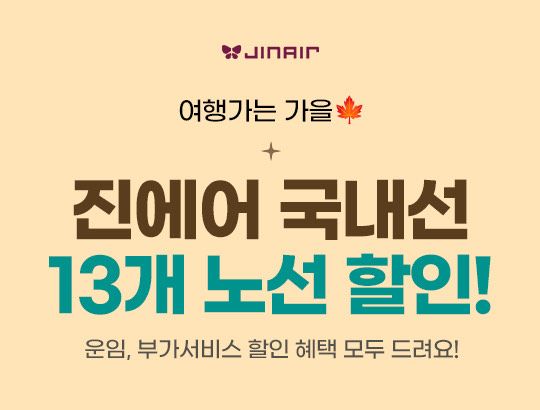 [파이낸셜뉴스] 진에어는 문화체육관광부와 한국관광공사에서 진행하는 '여행가는 가을' 캠페인에 참여해 국내 관광지를 찾는 여행객을 위한 특별 운임 할인 프로모션을 진행 중이라고 17일 밝혔다. 오는 10월 31일까지로 국내선 왕복 노선 구매 고객이 대상이다. 이용을 원하는 고객은 프로모션 페이지에서 2만원 정액 할인 쿠폰을 다운로드 받아 항공권을 결제하면 선착순 적용된다. 탑승 기간은 10월 14일부터 11월 16일까지다.