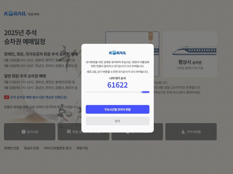 코레일은 15일부터 18일까지 나흘간 추석 승차권 예매를 진행한다. 지난 15~16일에는 65세 이상 고령자, 장애인, 국가유공자 등을 대상으로 사전 예매를 진행했다.
