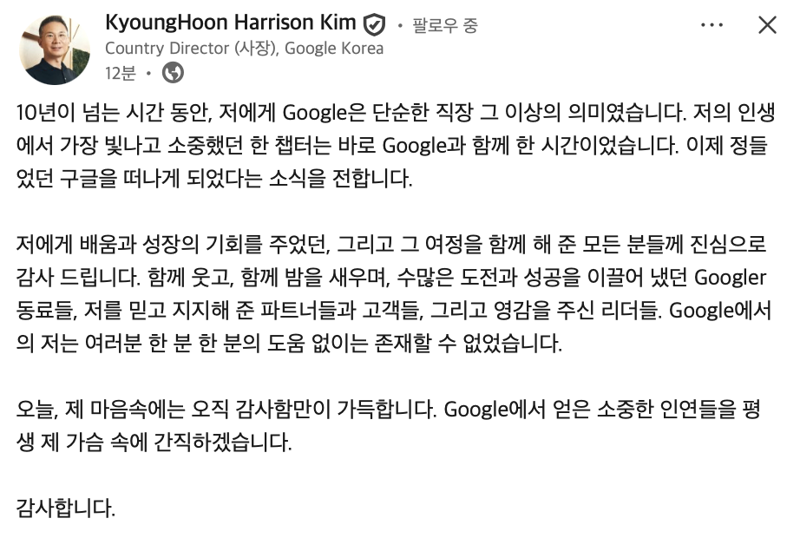 그는 "10년이 넘는 시간 동안 구글은 단순한 직장 그 이상의 의미였다"며 "인생에서 가장 빛나고 소중했던 한 챕터가 구글과 함께 한 시간이었다"고 했다.
