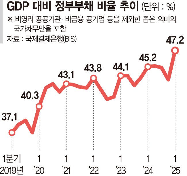 향후 정부부채 비율은 더 상승할 전망이다. 대내외 악재로 명목 GDP 성장률이 정체된 가운데 이재명 정부가 경기부양을 위해 과감한 재정 확장을 추진하고 있기 때문이다.
