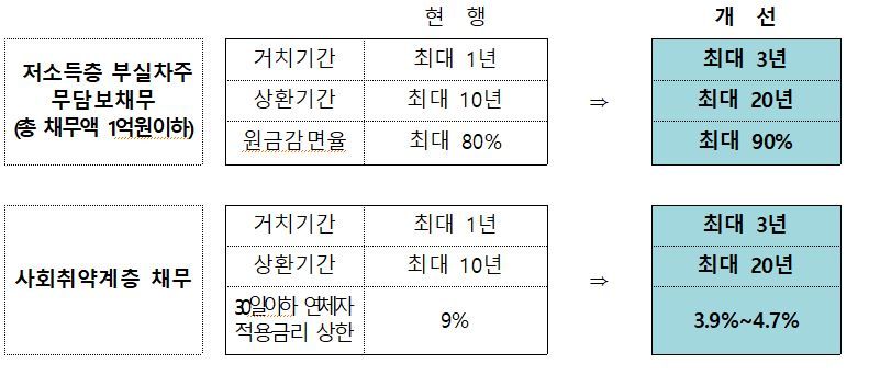 기초생활수급자, 중증장애인, 70세 이상 고령자 등 사회취약계층 채무에 대해서도 거치기간과 상환기간을 똑같이 각각 3년과 20년으로 연장하고 30일 이하 연체자의 채무조정 후 적용금리 상한은 현행 9%에서 3.9~4.7%로 인하한다.