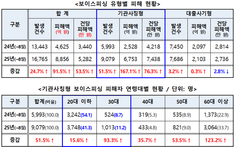 특히 2030 청년층의 피해가 크게 늘었다. 30대 피해자 수는 지난해 524명에서 올해 1013명으로 두 배 가까이 증가했다. 20대는 3242명에서 3748명으로 15.6% 늘었다. 기관사칭형 보이스피싱 피해자 중 2030 비중은 절반이 넘는다.