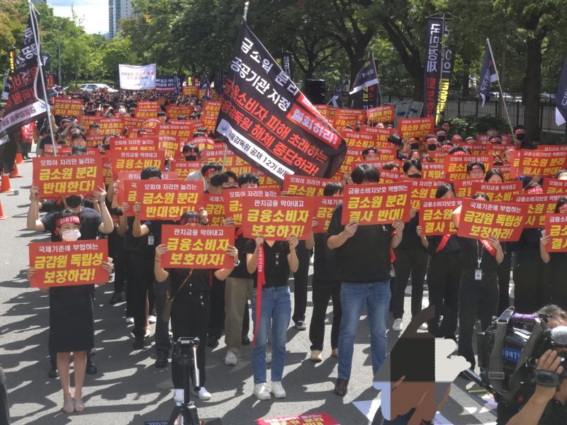 [파이낸셜뉴스] 금융감독원 비상대책위원회가 18일 서울 여의도 국회대로에서 집회를 열고 이재명 정부의 금융감독체계 개편은 개악이라고 소리쳤다. 금감원 비대위는 금융소비자보호원 분리·신설은 기관장 자리 나눠먹기용 불순한 획책이라고 주장했다. 집회에는 1200여명(경찰추산)이 참석했다. 금감원의 2444명 중 568명의 무기계약직을 제외한 1876명의 약 60%가 참여한 것이다.