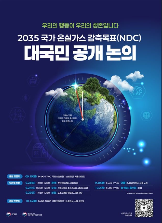 이번 대국민 공개 토론회는 총괄토론(19일)을 시작으로 전력·산업·수송·건물·농축산 및 흡수원 등 5개 부문별 토론(9월 23일~10월 2일), 종합 토론(10월 14일) 순으로 진행한다.
