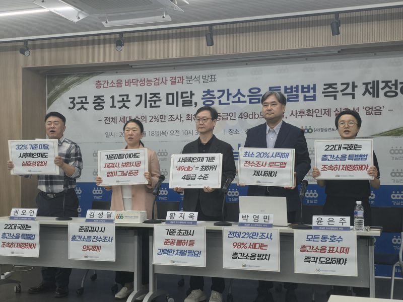 경제정의실천시민연합(경실련)은 18일 오전 서울 종로구 경실련 강당에서 '층간소음 사후확인제 성능 검사 결과 분석 발표' 기자회견을 열고 이같이 밝혔다. 층간소음 사후확인제란 지난 2022년 8월 도입된 제도다. 조사 대상이 되는 공동주택 전체 세대 중 2~5%를 무작위로 선정해 바닥충격음 차단 성능을 측정하도록 한다.