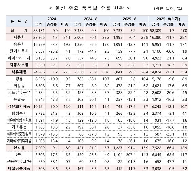 한국무역협회 울산지역본부 관계자는 "조선 등 일부 품목의 호조로 지난달 수출은 선방했지만 미국의 관세 부과로 자동차와 자동차부품 수출이 감소세로 돌아섰다"라며 "한·미 무역 합의 이후 자동차부품 원산지 관리의 중요성이 커진 만큼 관련 기업에 대한 컨설팅 등 지원사업을 확대해 나가겠다"라고 밝혔다.