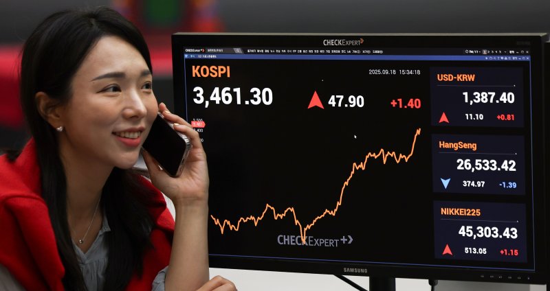 [파이낸셜뉴스] 코스피가 3460선을 돌파하며 사상 최고치를 재차 갈아치웠다. 미국 연방공개시장위원회(FOMC)의 금리 인하 결정에 힘 입어 대형 반도체주를 중심으로 상승세를 이어갔다.