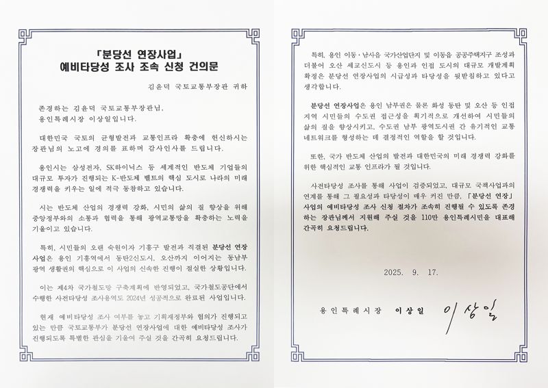 이에 대해 이상일 시장은 서한에서 "용인 남부권과 동탄·오산 시민들의 교통수요와 시민 불편을 고려할 때 분당선 연장사업을 더 이상 늦춰서는 안된다"며 정부의 조속한 예비타당성 조사 착수와 신속한 행정절차 진행을 요청했다.