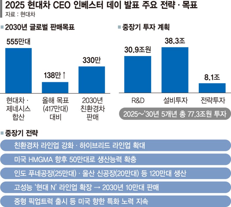 【파이낸셜뉴스 뉴욕·서울=이병철 특파원 김학재 기자】현대자동차가 오는 2030년까지 친환경차 라인업 강화로 글로벌 자동차 판매 555만대를 달성하겠다는 목표를 제시했다. 올해 25% 수준인 친환경차 판매 비중을 2030년에 60%로 크게 늘리겠다는 것으로, 내연기관차 중심의 판매에서 벗어나 친환경차 중심으로 완전히 재편하겠다는 방침을 분명히 했다. 아울러 현대차는 픽업트럭·전기 상용 밴 출시로 북미 시장 공략을 강화하고 6세대 완전 자율주행 기술 '웨이모 드라이버'의 아이오닉 5 적용, 아마존을 통한 차량 판매 등 북미 특화 중장기 전략도 대거 공개했다.