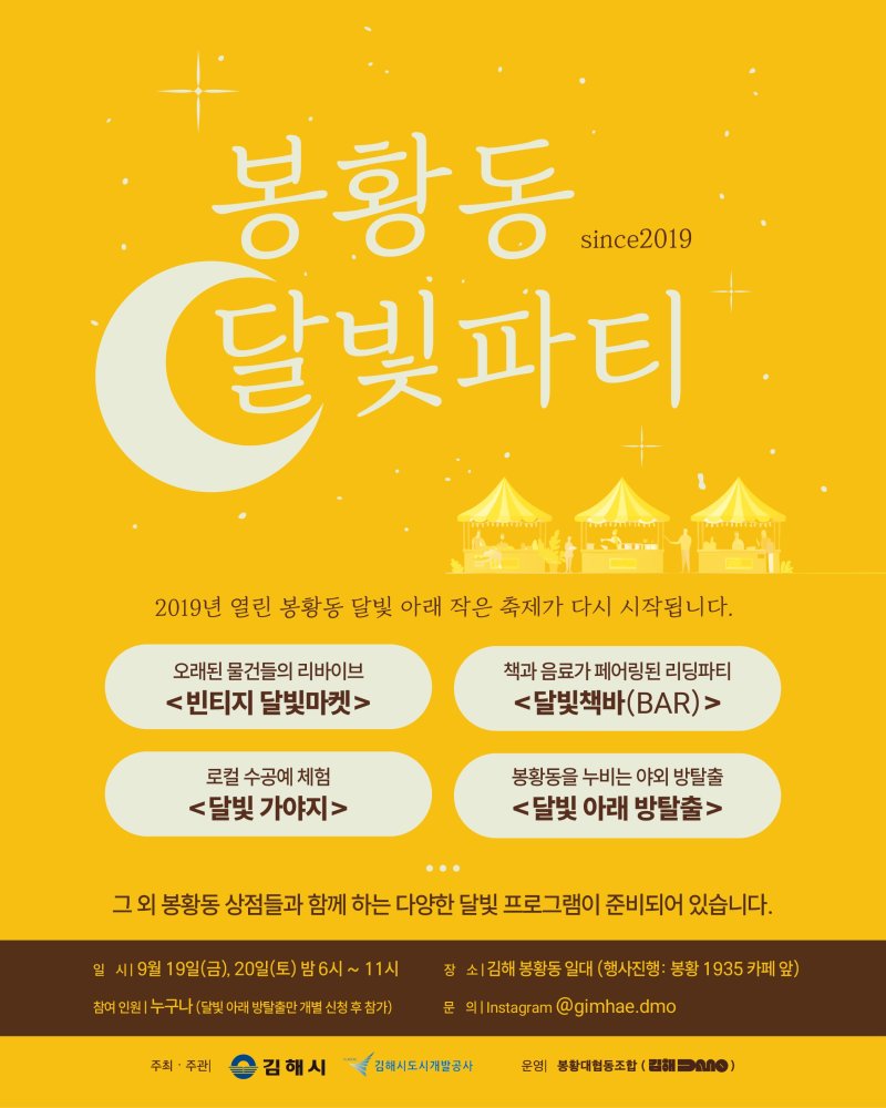 [김해=뉴시스] 김상우 기자 = 김해 DMO(지역관광추진조직)인 봉황대협동조합은 19일, 20일 오후 6시부터 11시까지 봉황동 일대에서 ‘봉황동 달빛 파티’를 개최한다.