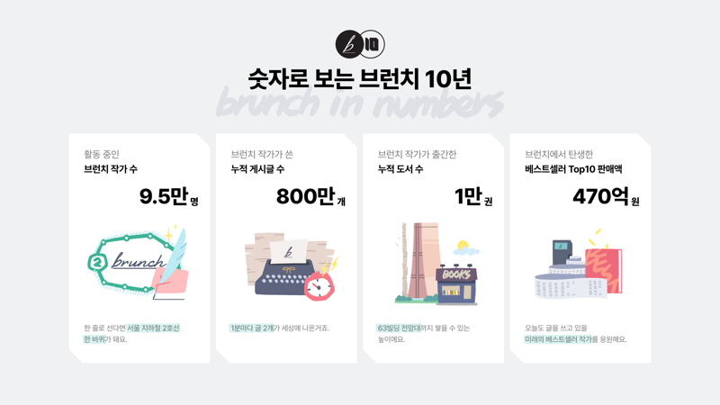 이달 기준 등록된 브런치 작가는 9만 5000명, 이들이 작성 누적 게시글 수는 800만 개를 돌파했다. 특히 브런치에서 선보인 작품들이 종이책 출간으로 이어지면서 브런치 원작 도서도 1만 권이 넘는다. 이 중에서 베스트셀러 TOP 10에 해당하는 도서 매출은 470억 원을 기록하는 등 창작 생태계의 새로운 판로를 개척했다는 평가를 받아왔다.
