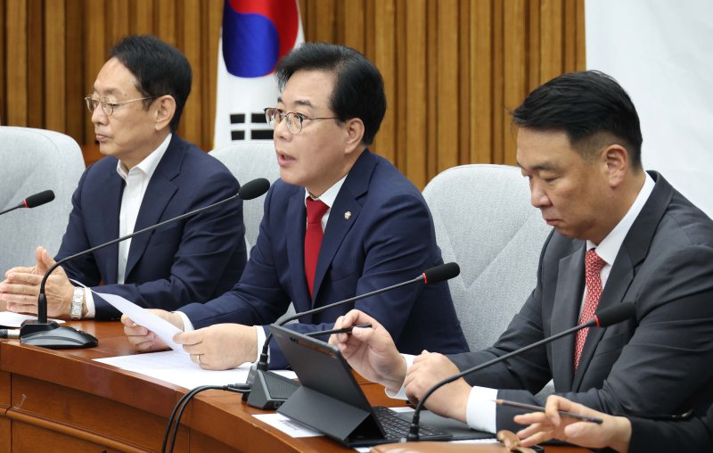 송언석 국민의힘 원내대표는 이날 국회에서 원내대책회의를 열고 "민주당이 특별재판부 설치법안을 발의했다"며 "한쪽에서는 조희대 대법원장을 흔들며 사법부 전체를 압박하면서, 다른 한쪽에서는 절대 다수 의석을 무기로 위헌적 법률을 만들어 헌법 법치주의 질서를 파괴하고 있는 것"이라고 지적했다.