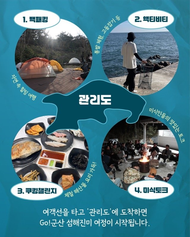 시는 관리도 캠핑장을 주 무대로 삼아 ▲ 섬 주민과 함께하는 고동 잡기·통발 설치 어촌 체험 ▲ 제철 해산물과 관리도 식재료를 활용한 셰프 챌린지 ▲ 지역민이 직접 전하는 섬 해설 프로그램 등을 준비했다.