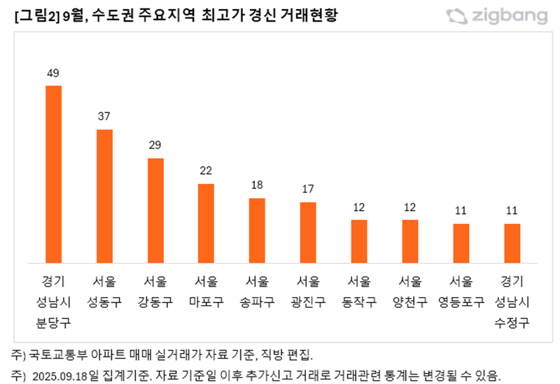 서울에서는 △성동구(37건) △강동구(29건) △마포구(22건) △송파구(18건) △광진구(17건) △동작구·양천구(각 12건) △영등포구(11건) 등에서 최고가 경신 거래가 확인됐다.