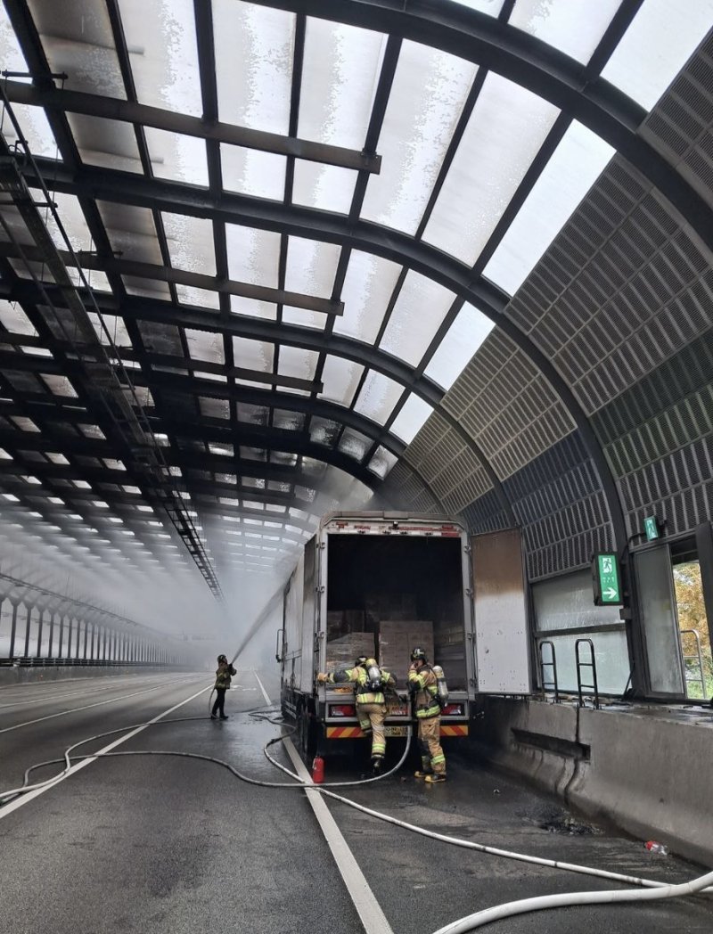불이 난 화물차 운전자는 스스로 대피했으며 현재까지 확인된 인명 피해는 없는 것으로 전해졌다.